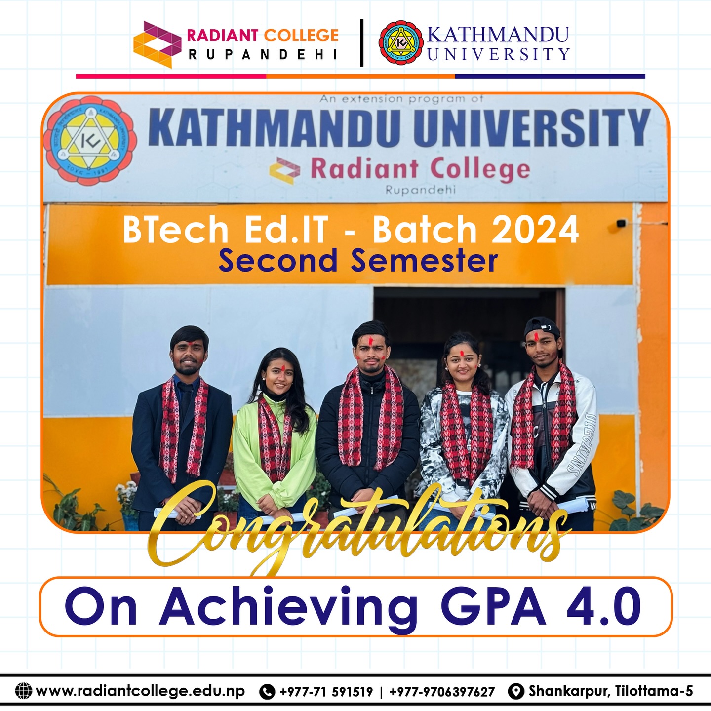 Radiant College proudly congratulates five BTech Ed. IT second-semester students—Golu Kohar, Aakriti Gautam, Madan Pandey, Monika Pandey, and Rup Kumar Pasi—for achieving a perfect 4.0 GPA. Their exceptional performance reflects strong dedication, consistency, and excellence in both technology and education.
