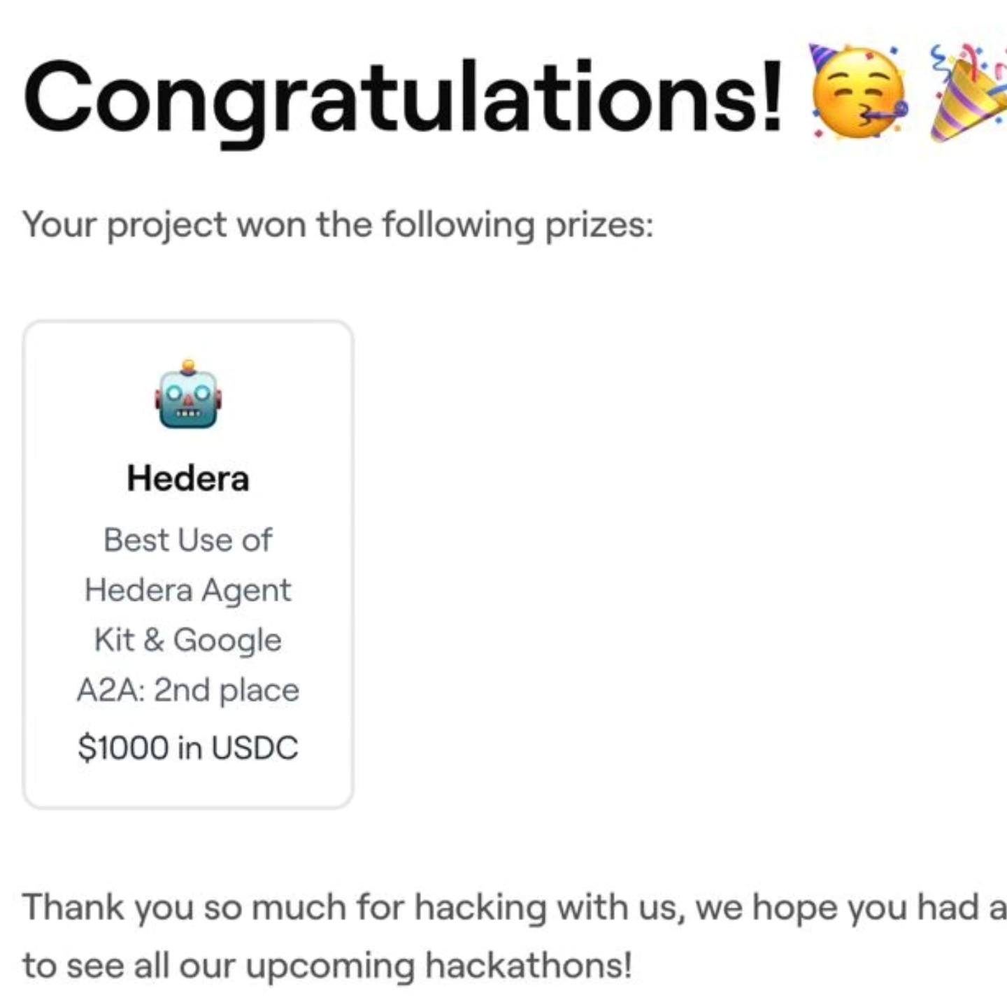 Our team’s project stood out for its creative and technically capable use of the Hedera Agent Kit and Google’s A2A solution, demonstrating the power of agent-driven user experiences in the evolving decentralized Web3 landscape.